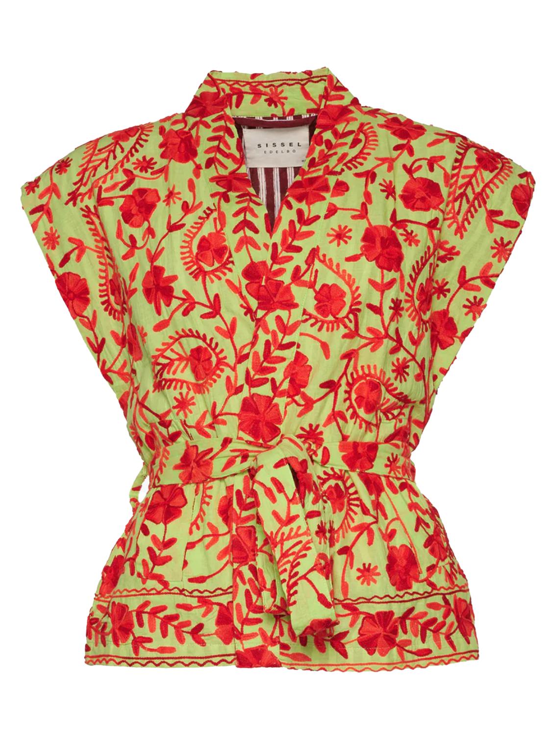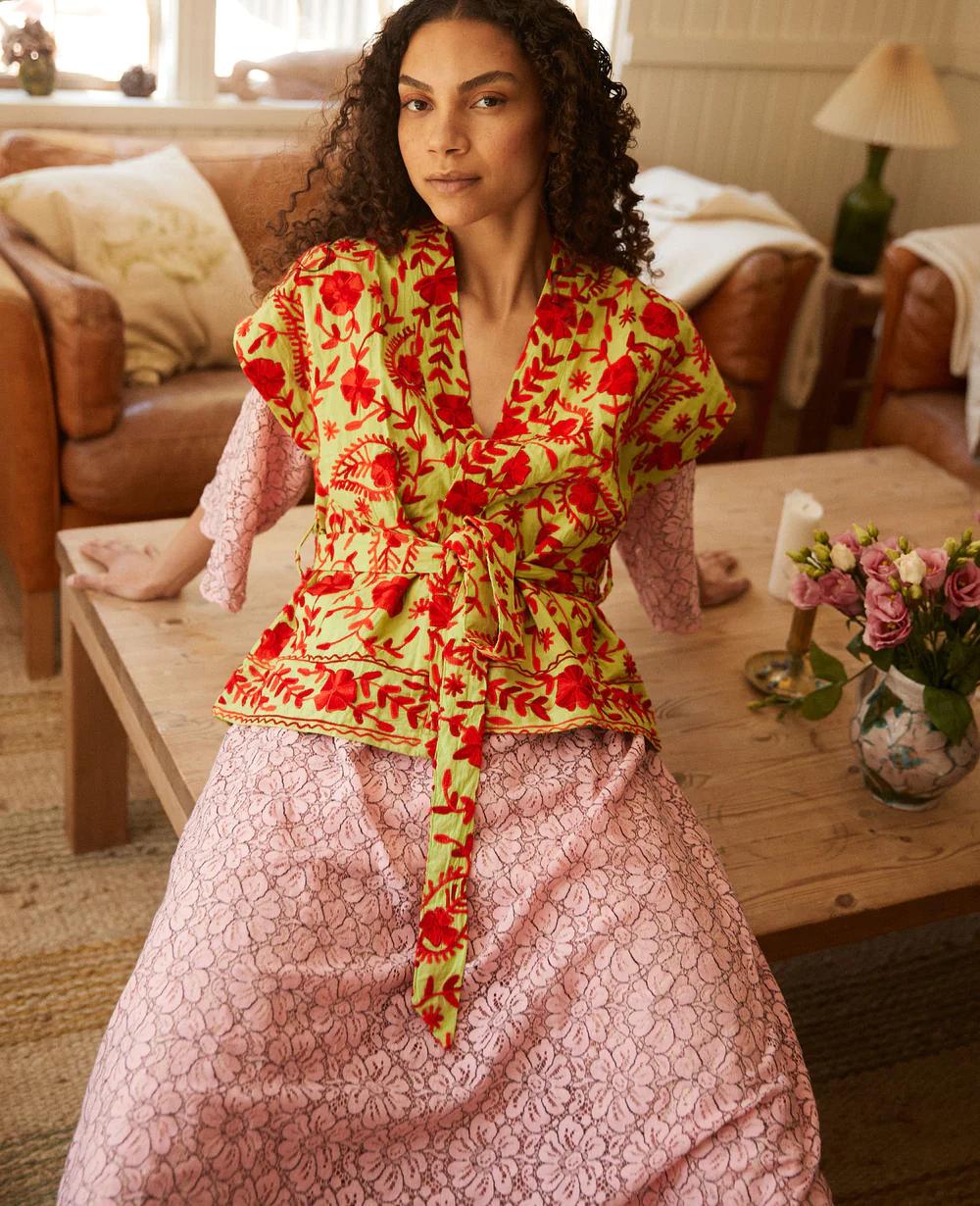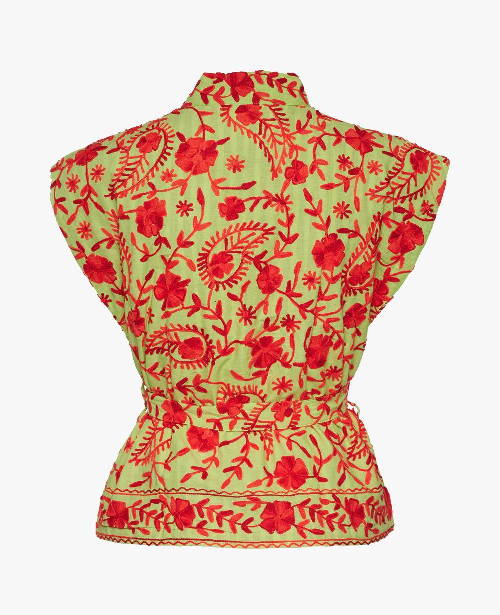 Fauna Suzani Vest (col Red Forest) is gemaakt van zacht, groen katoenmateriaal. Het is versierd met Suzani-borduurwerk in rode tinten. Het vest wordt geleverd met een afneembare riem om de vrouwelijke vorm te benadrukken. Fauna Suzani Cotton Vest is gevoerd met een bijpassende kleur katoenen voering. Het vest heeft brede schouders en zakken aan de voorkant.