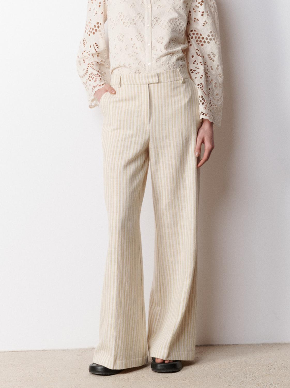 Mathilda is onze broek van katoenen keperstof. Ze hebben een rechte, licht uitlopende snit en een hoge taille. Detail van riemlussen. Haak- en ritssluiting aan de voorzijde. De fijne tweekleurige strepen voegen een vleugje licht toe aan je zomergarderobe. Gemaakt van gevlamd draad om het kledingstuk een onderscheidende uitstraling te geven.