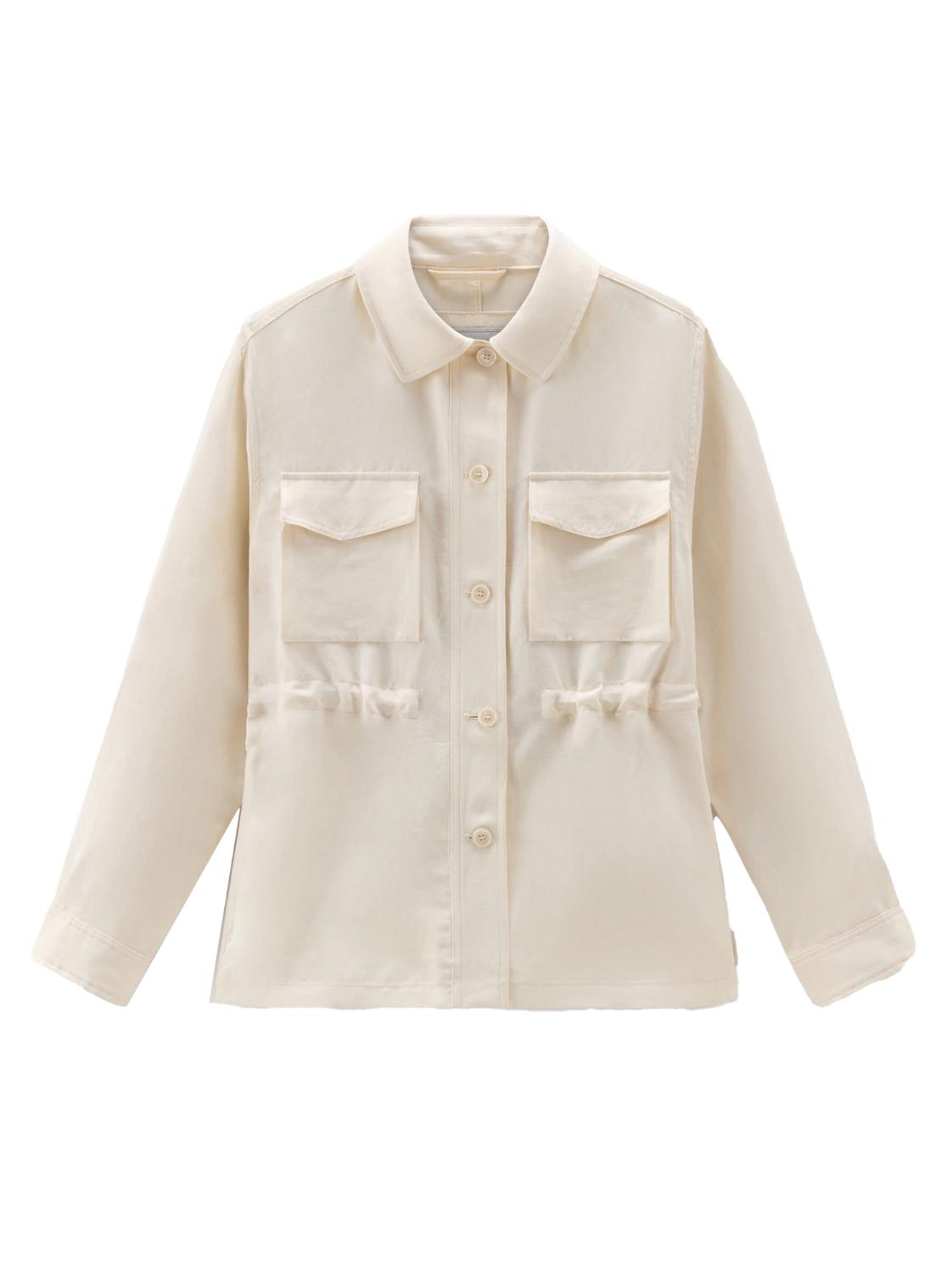Een klassieker voor avonturen in de buitenlucht, geherinterpreteerd in vrouwelijke proporties. Dit overhemdjack is gemaakt van een mix van viscose en linnen met een frisse en delicate textuur. Het model is ideaal voor het tussenseizoen en is afgewerkt met een trekkoord in de taille, een klassieke puntkraag, een knoopsluiting en borstzakken.