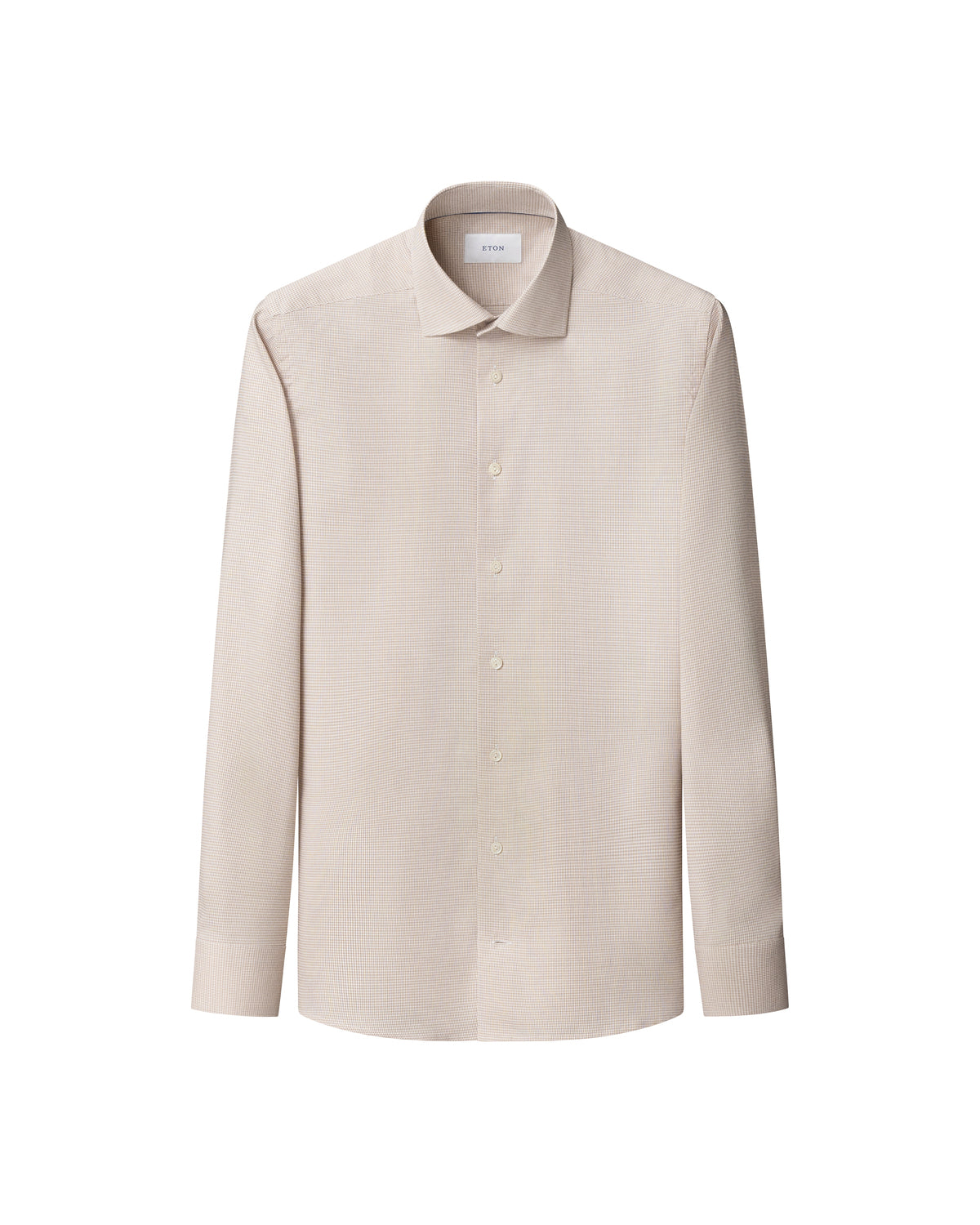 Een stijlvol slim fit overhemd van Eton in een warme beige tint. Dit shirt is gemaakt van hoogwaardig, soepel katoen met een gladde afwerking, waardoor het ideaal is voor zowel formele gelegenheden als smart-casual outfits. De slanke pasvorm zorgt voor een moderne, gestroomlijnde look, terwijl het verfijnde design het overhemd een tijdloze klasse geeft. Perfect te combineren met zowel donkere pantalons als lichtere seasonal kleuren.