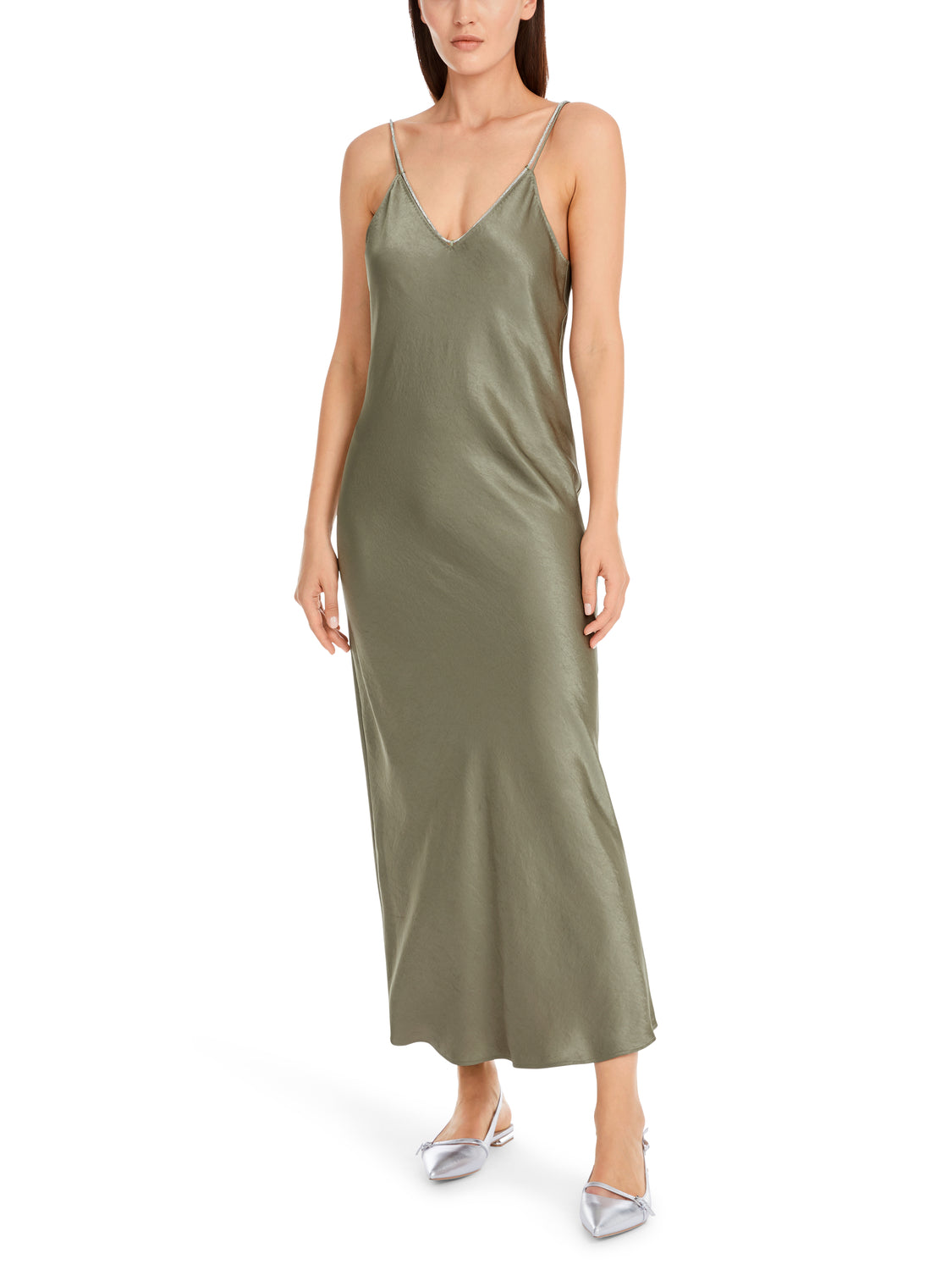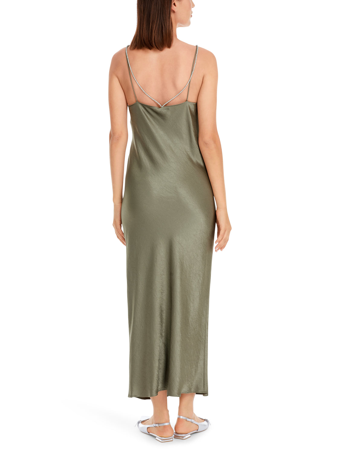 Het hoogtepunt van deze jurk met lange bandjes is het strikkoord met strass-steentjes aan de diepe V-hals. De jurk maakt ook indruk met zijn zachte, vloeiende materiaal en subtiele glans. Hij zit losjes om het figuur. Het stikseleffect aan de randen is een prachtig detail.