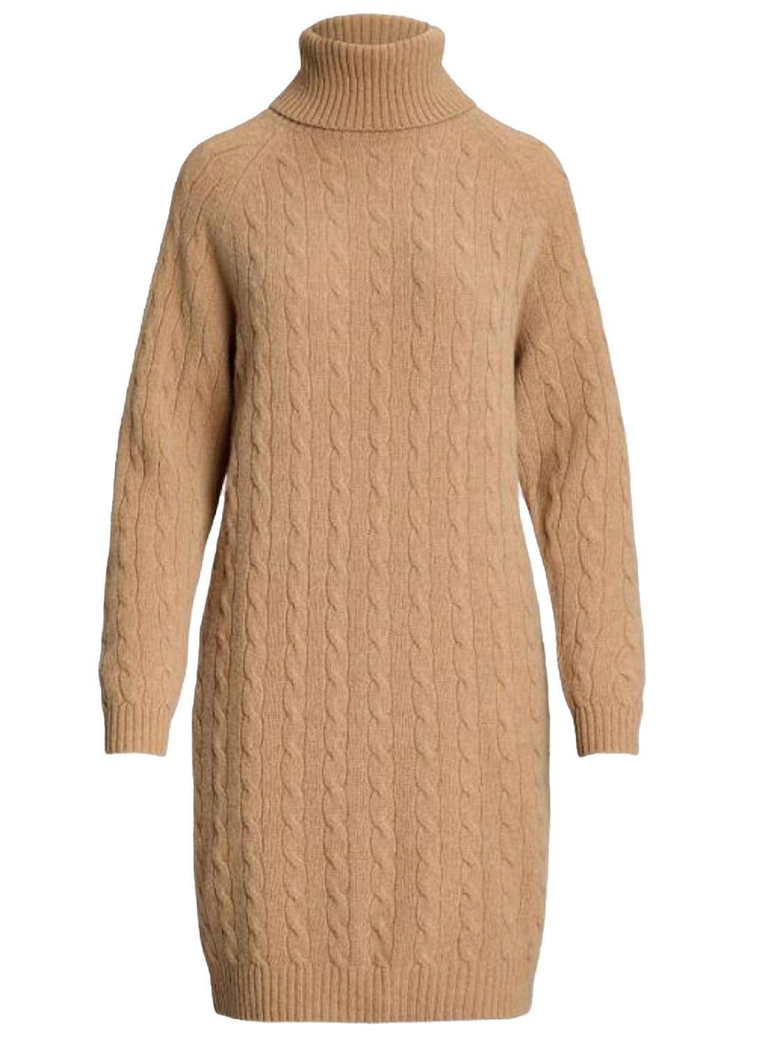 Een luxe mix van Italiaanse wol en kasjmier komt samen met de kenmerkende kabelgebreide constructie in deze jurk met coltrui.