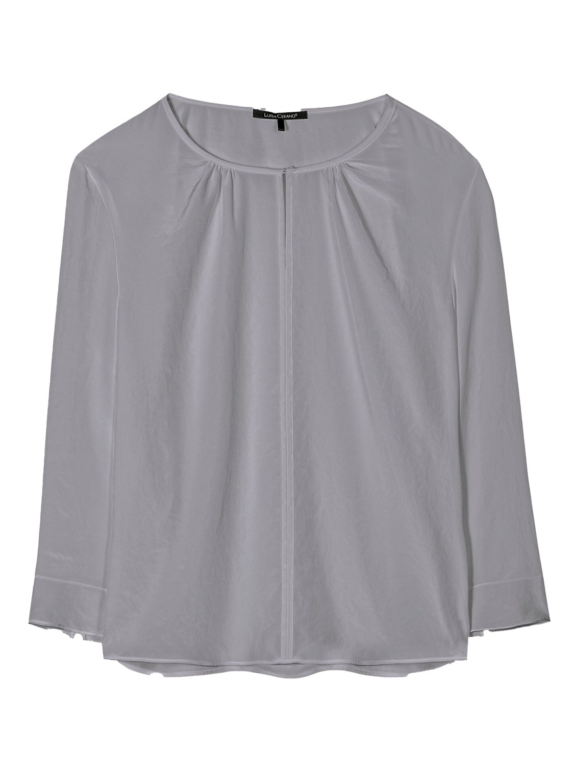 Kraagloos blouseshirt van vloeiende technozijde met ronde hals met split en knoopsluiting. De 3/4-mouwen eindigen met een brede manchet met één knoop. De middennaad aan de voorkant en de afgeronde zoom onderstrepen de casual look.