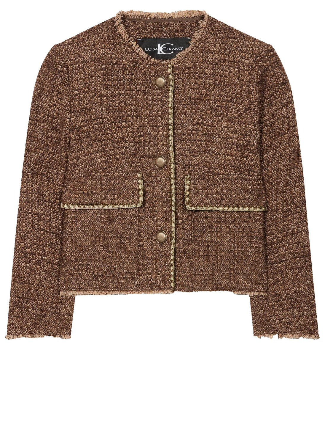 Kraagloos, cropped tweed jasje met ingeweven glanzend garen. Het jasje is volledig opengewerkt en heeft fijne franjes aan de uiteinden. Goudkleurige metalen knopen, opgestikte klepzakken en de ingewikkelde schelpsteek maken het elegante ontwerp compleet.