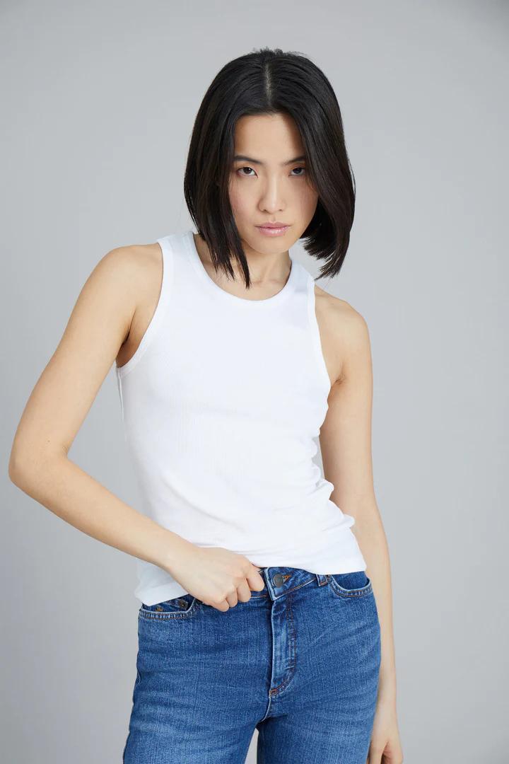 Zachte tanktop gemaakt van een Ecovero viscosemix. De tank heeft een dunne ribboord in de ronde halslijn en een slanke pasvorm die net zo goed gelaagd werkt als op zichzelf. De tank is verkrijgbaar in 5 kleuren,