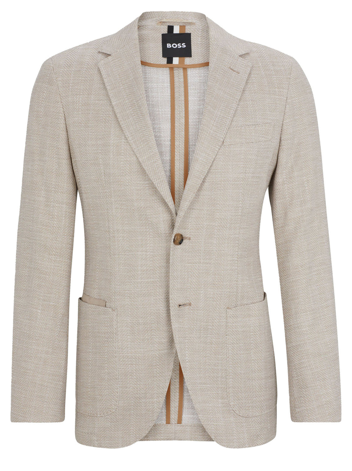 Een regular-fit colbert van BOSS Menswear. Dit design van een katoenmix met linnen en stretch kenmerkt zich door een visgraatdessin, een zachte schouderconstructie en elleboogpatches.