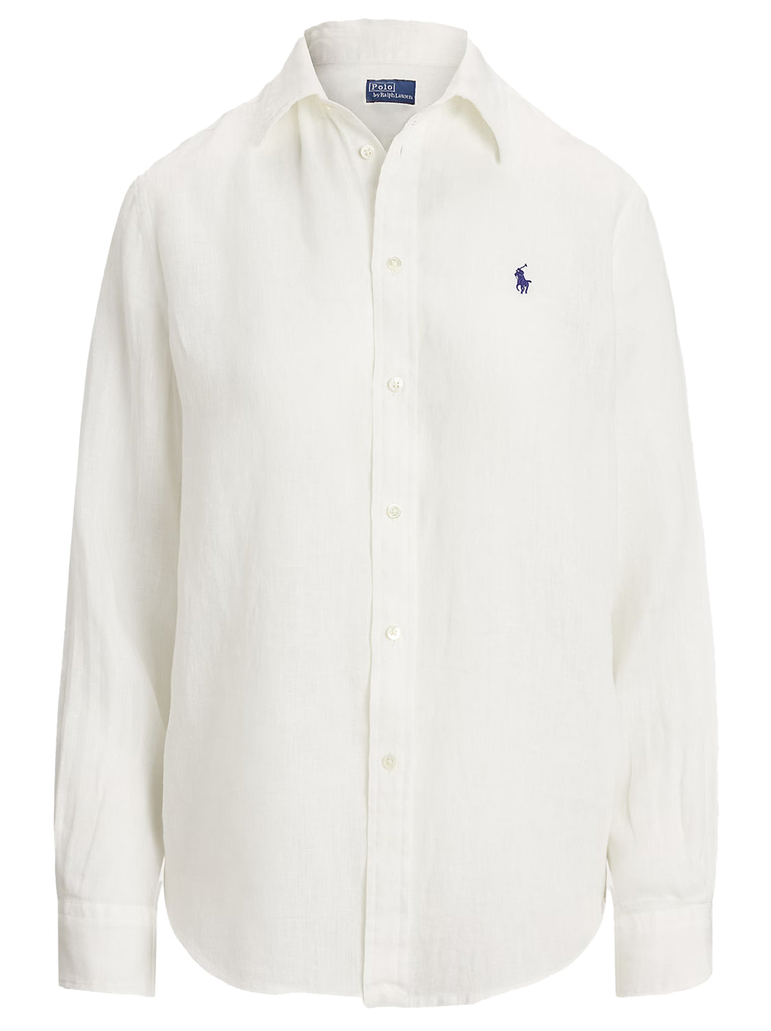 Puntkraag, knoopsluiting aan de voorkant, contrasterend logoborduursel op de borst, centrale vouw op de rug, manchetten met knopen, uitlopende zoom