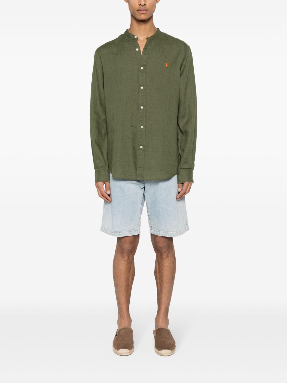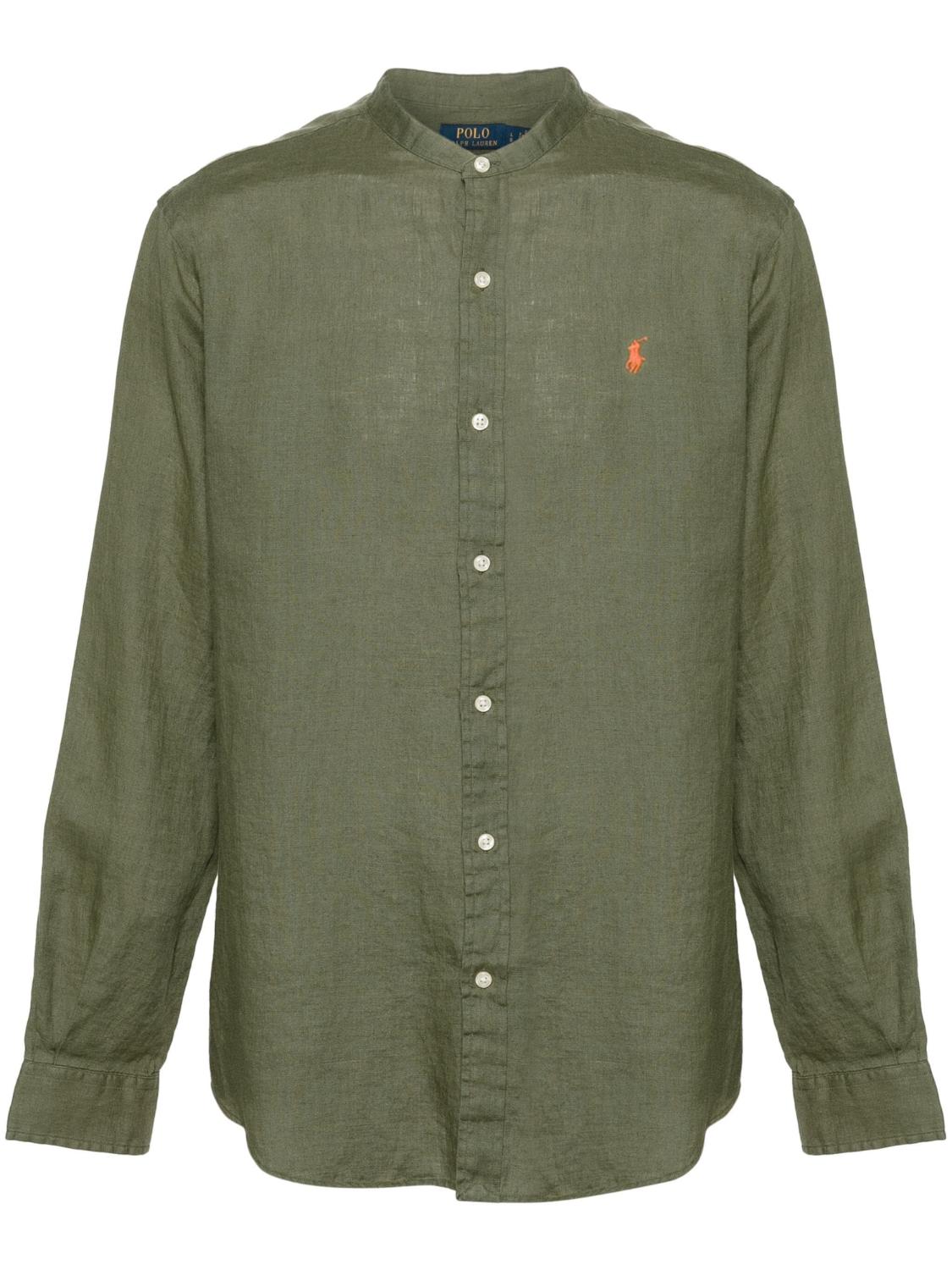 Dit overhemd is olijfgroen van kleur en gemaakt van linnen of vlas met een popeline textuur. Het heeft het kenmerkende Polo Pony patroon geborduurd op de borst, geplooide details op de mouwen en een geplooid detail aan de achterkant. Het heeft een bandkraag, lange mouwen met knoopmanchetten en een afgeronde zoom. Het is ongevoerd en sluit aan de voorkant met knopen.