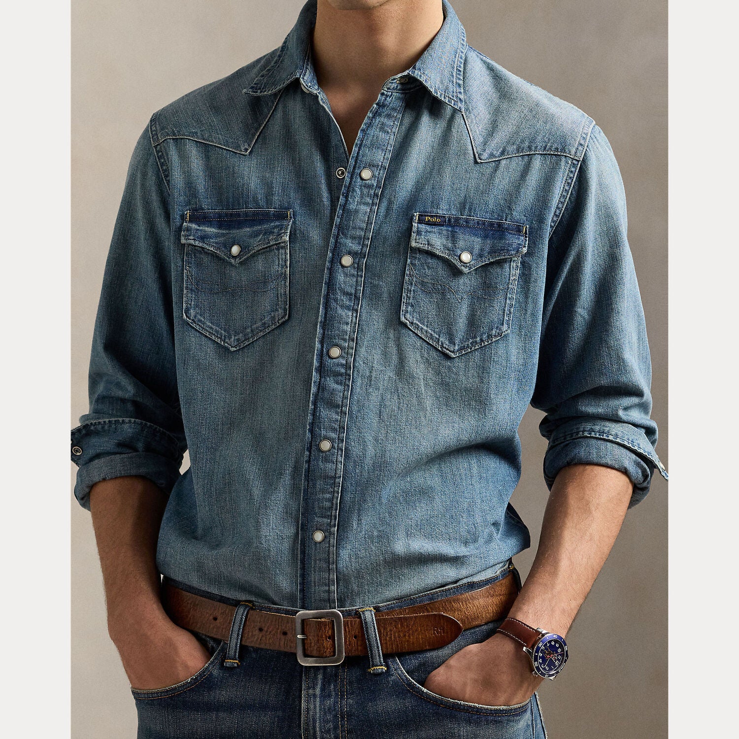 POLO Ralph Lauren Slub Denim Western Shirt – Blauw-100% katoen-HEREN SHIRTS-Blauw
