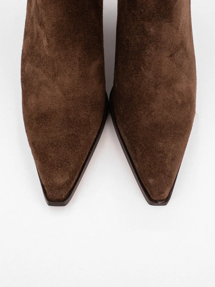 De Toral Scarlet Country Laarzen – Mustang combineren Western-invloeden met moderne elegantie. Deze laarzen zijn vervaardigd uit hoogwaardig suède in een warme bruine mustangkleur, wat zorgt voor een rijke, natuurlijke uitstraling. De karakteristieke westernstiksels, puntneus en schuin aflopende hak geven het model een authentieke look, terwijl de comfortabele pasvorm en stevige zool zorgen voor draaggemak. Perfect te combineren met jurken, rokken of jeans — een stijlvolle statementboot voor het najaar.