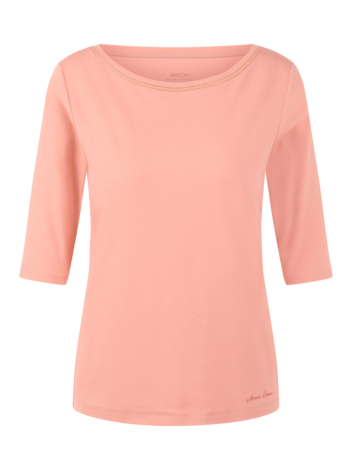 Een fris en vrouwelijk T-shirt van Marc Cain Collections, uitgevoerd in een zachte roze tint. De hoogwaardige jerseykwaliteit biedt optimaal draagcomfort, terwijl de perfecte pasvorm zorgt voor een moderne, verfijnde uitstraling. Ideaal als basic onder een jasje of vest, maar ook prachtig om solo te dragen voor een cleane, stijlvolle look.