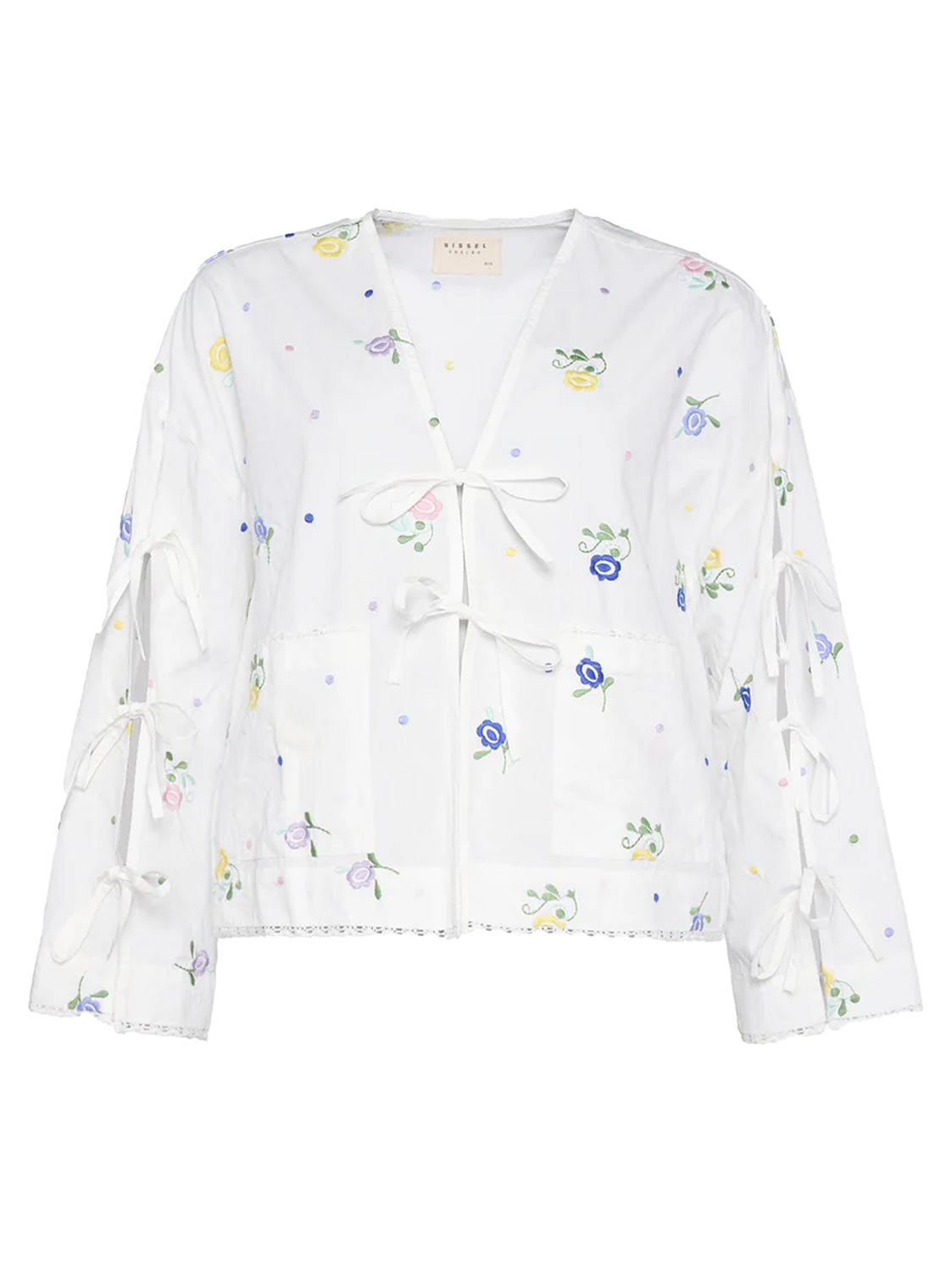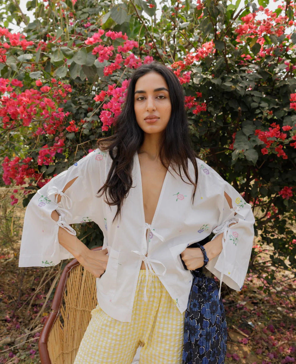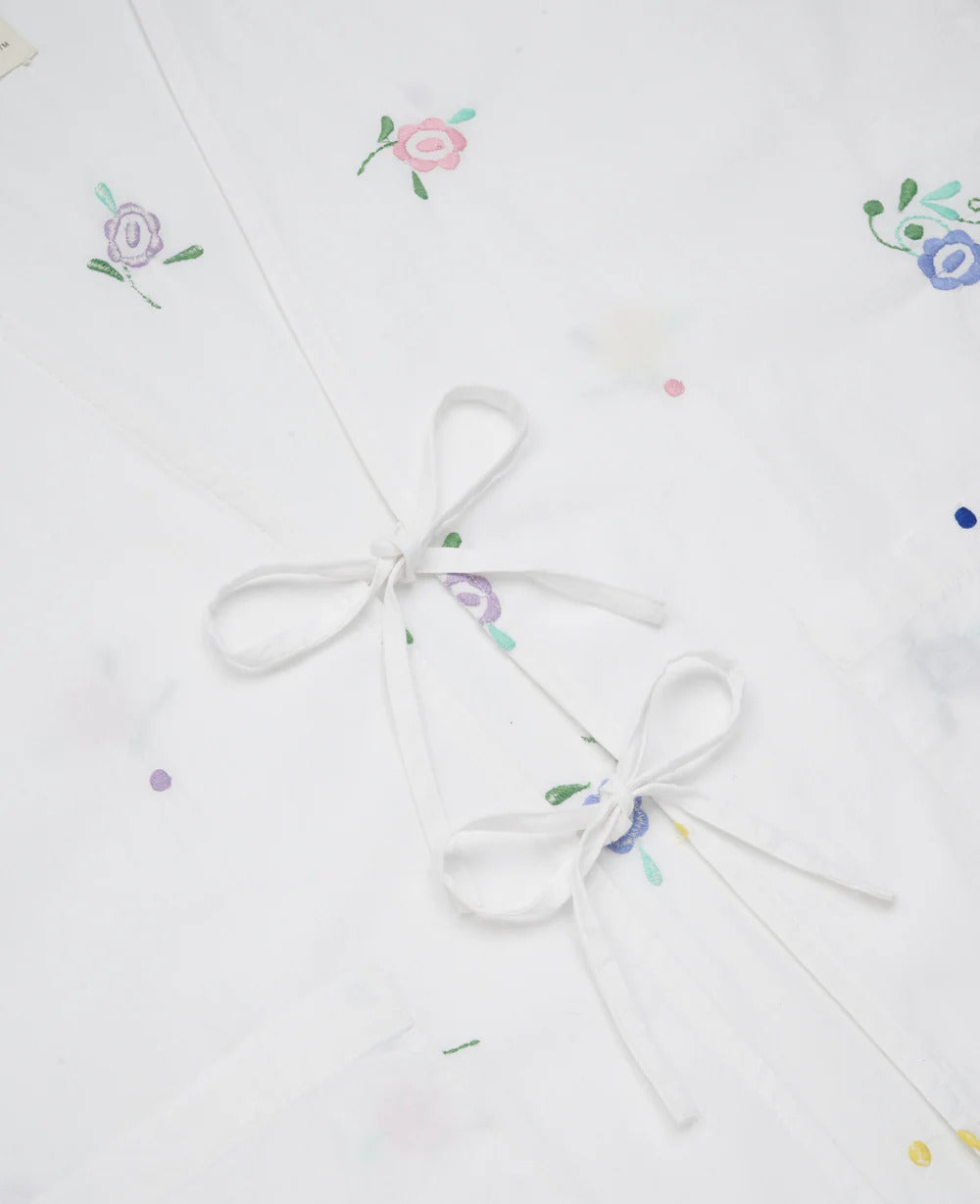 Das Coho Top besteht aus 100 % Bio-Baumwolle und ist wunderschön mit Blumen- und Punktstickereien bestickt. Es verfügt über einen tiefen V-Ausschnitt, zwei Fronttaschen und eine offene Knopfleiste, die mit Bändern gebunden werden kann. Die langen Ärmel sind außen offen und werden mit drei Bändern befestigt.
