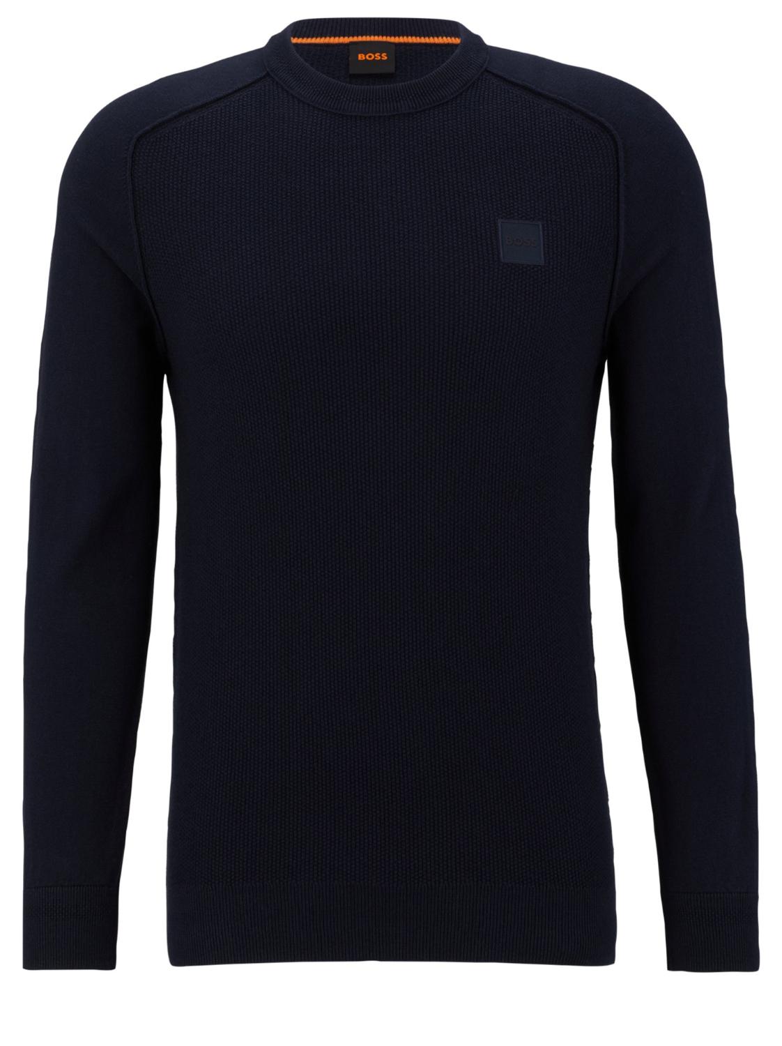Ein leichter Pullover mit normaler Passform von BOSS Menswear. Der Rundhalspullover verfügt über einen charakteristischen gewebten Logo-Patch auf der linken Brust und ist aus einer Baumwollmischung mit einem Hauch von luxuriösem Kaschmir gestrickt. Die Kombination verschiedener Texturen verleiht diesem Stück Charakter.