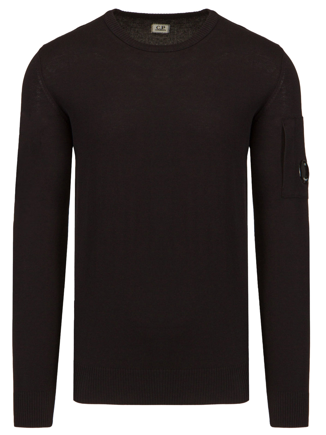 Dieser schwarze Pullover besteht aus fein gestrickter Baumwolle mit gerippter Oberfläche. Er hat einen Rundhalsausschnitt und lange Ärmel, das charakteristische Lens-Detail am Ärmel und eine Reißverschlusstasche. Der Pullover hat außerdem einen gerippten Saum. Die Marke empfiehlt, alle abnehmbaren Accessoires vor dem Waschen zu entfernen.
