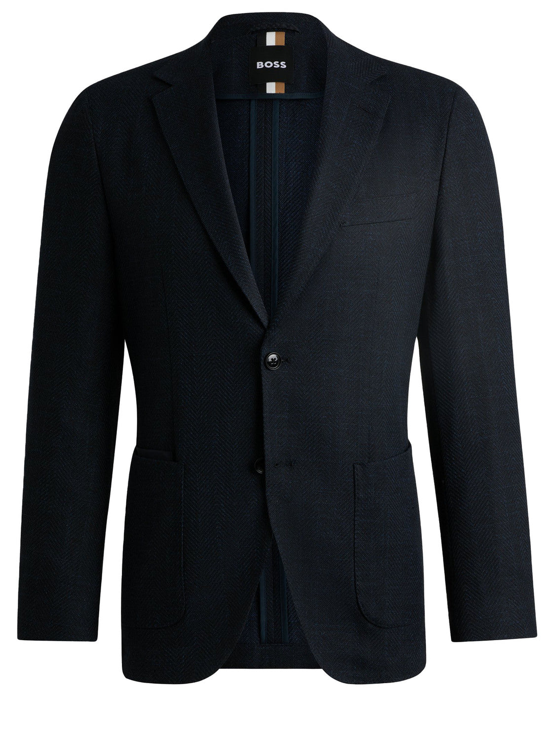 Ein Blazer in normaler Passform von BOSS Menswear. Dieses Design aus einer Baumwollmischung mit Leinen und Stretch verfügt über ein Fischgrätenmuster, eine weiche Schulterkonstruktion und Ellbogenflicken.