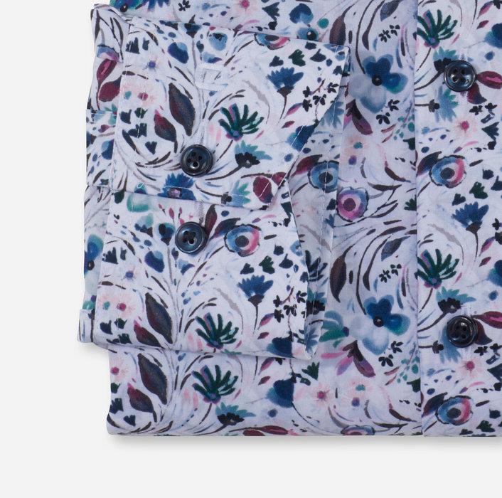Mehrfarbiges OLYMP Luxor Businesshemd mit frischem Rosenholz-Blumendruck. Die hautfreundliche Textur feinster Baumwollgarne garantiert angenehmen Tragekomfort und zeitsparende Pflege, während die attraktive, schlanke Linienführung einen unverwechselbaren Business-Look kreiert. Ausgestattet mit kosmopolitischem Global-Kent-Kragen und extralangen Ärmeln.
