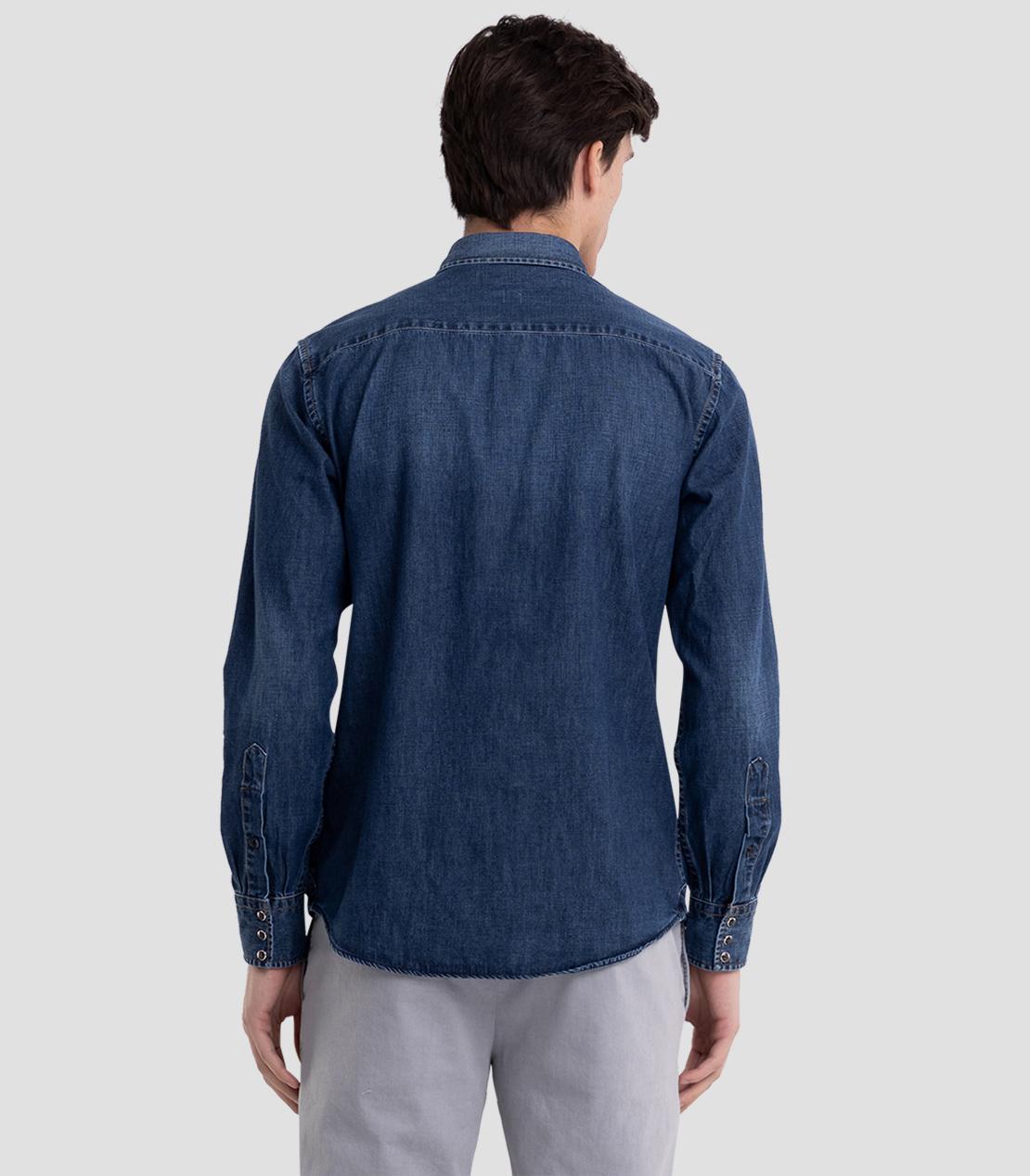 Dieses Hemd im Regular-Fit ist aus 7oz tiefblauem Baumwoll-Denim mit dunkler Stonewash-Waschung gefertigt. Inspiriert vom Westernstil, verfügt das langärmelige Kleidungsstück über eine gerade Passe und zwei klassische Pattentaschen auf der Brust. Die dezenten Handnähte erzeugen dezente Farbkontraste in den Used-Looks und sorgen für einen Vintage-Effekt.