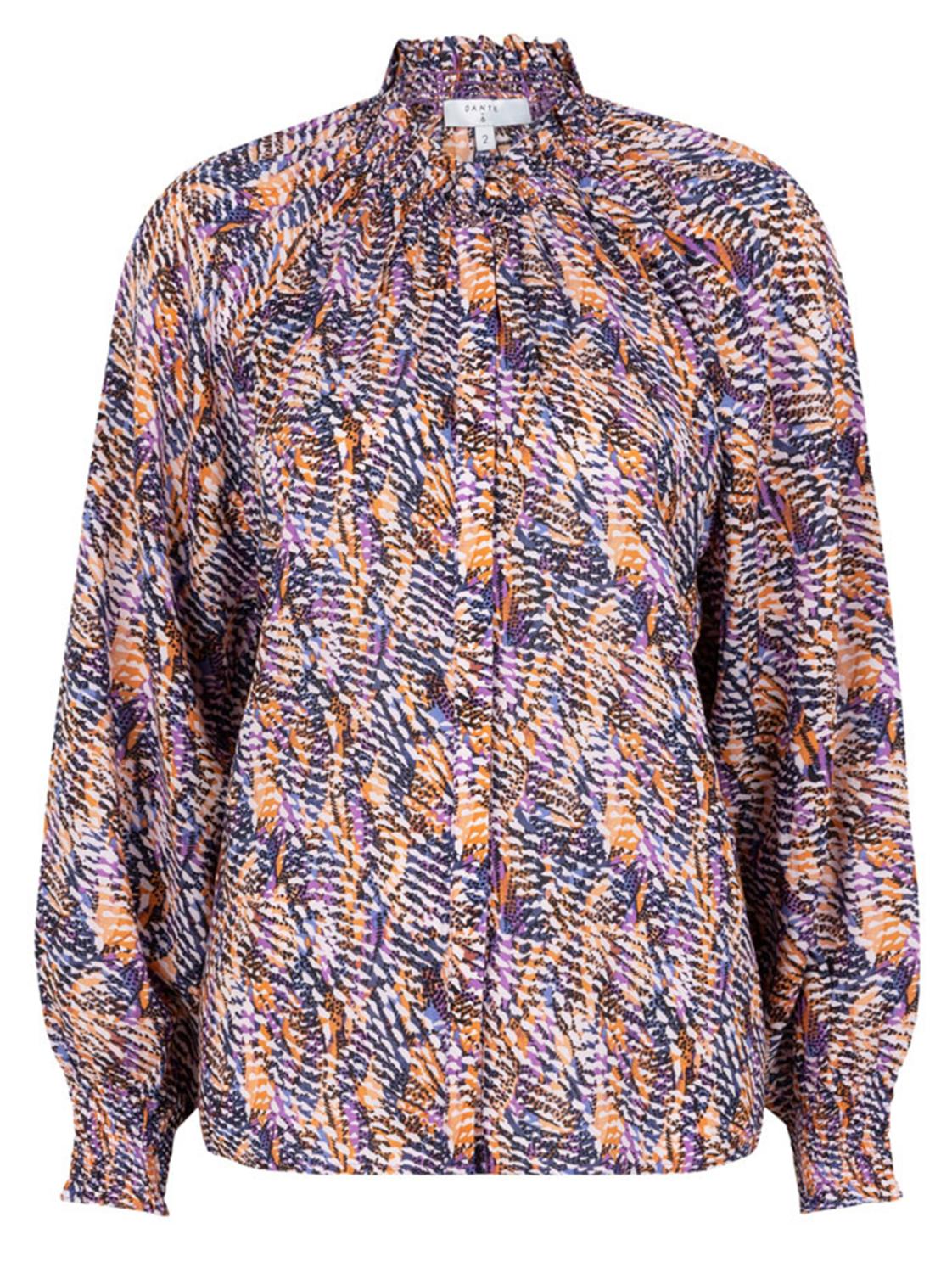 Breng een vleugje kleur in je garderobe met deze vrouwelijke, vrolijke blouse met print. Hij is gemaakt van een duurzame modalmix. De blouse is ontworpen met aandacht voor detail. Met zijn gesmokte elementen, opstaande kraag en volumineuze, vloeiende mouwen is dit een echt Dante6 item. Combineer deze blouse met een jeans voor een casual look of een getailleerde, nette broek voor een elegante outfit.