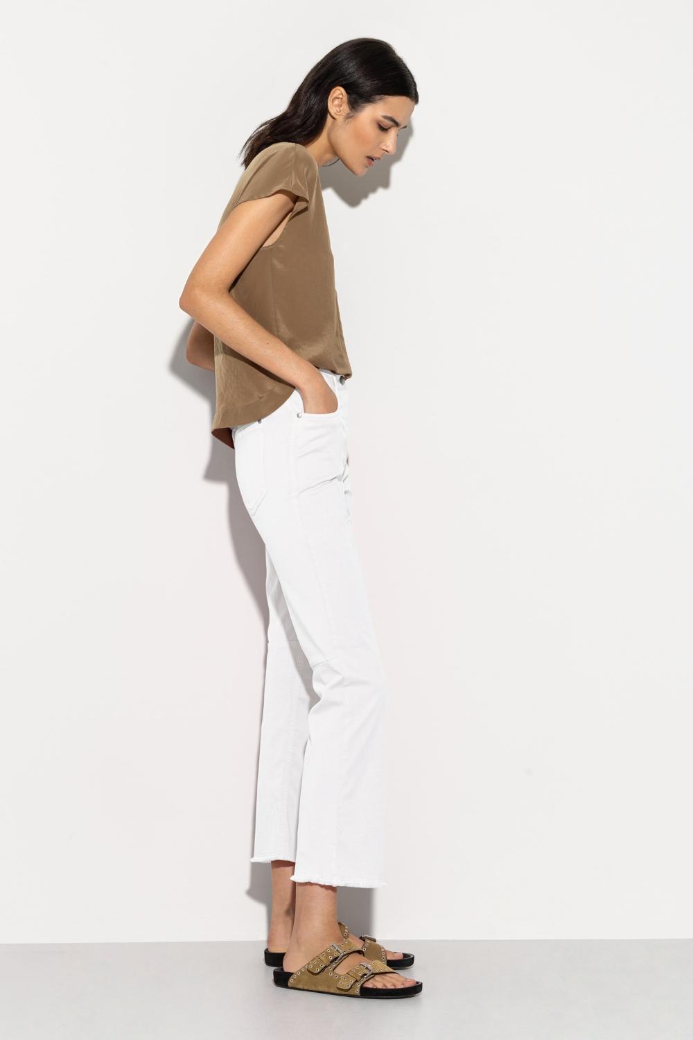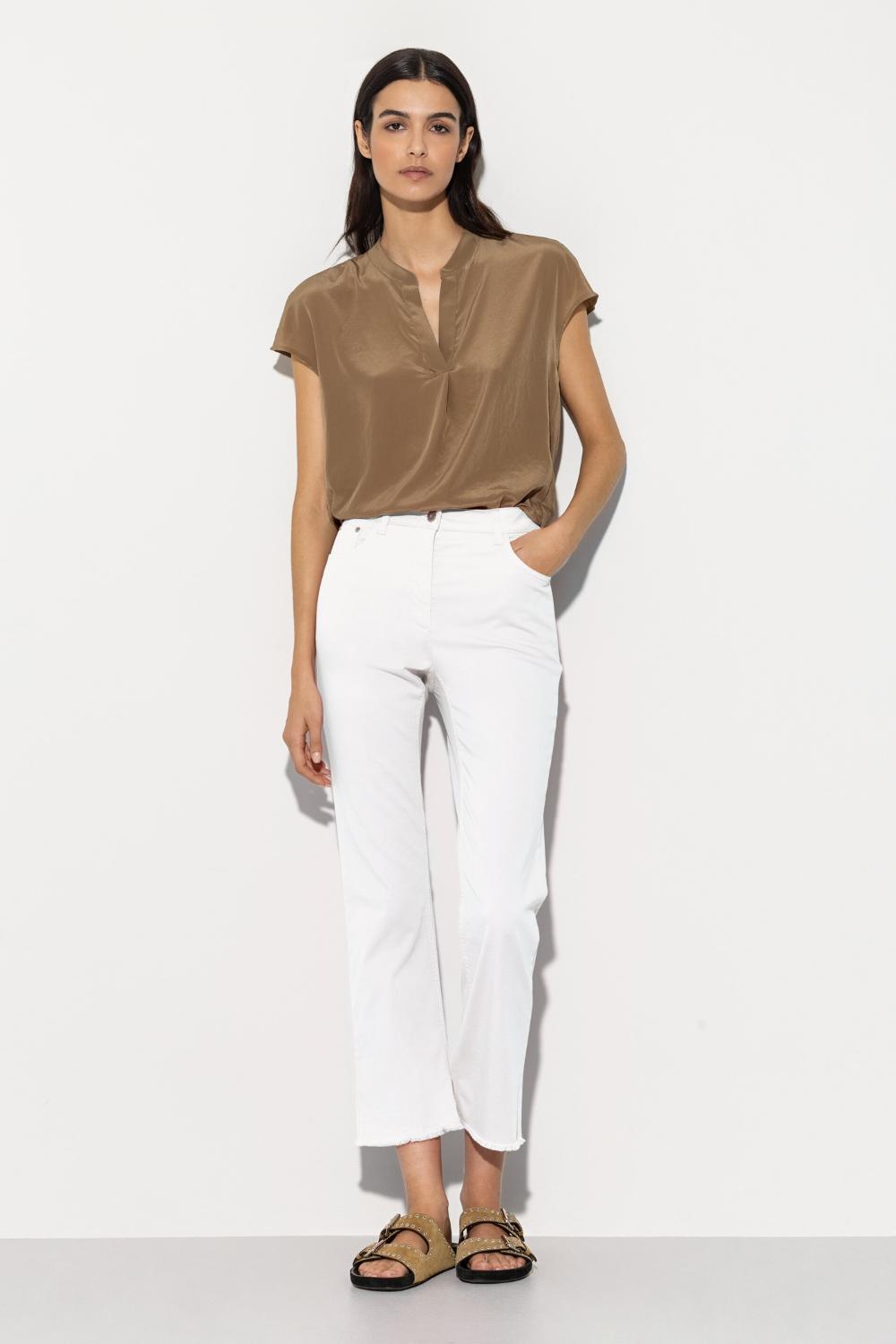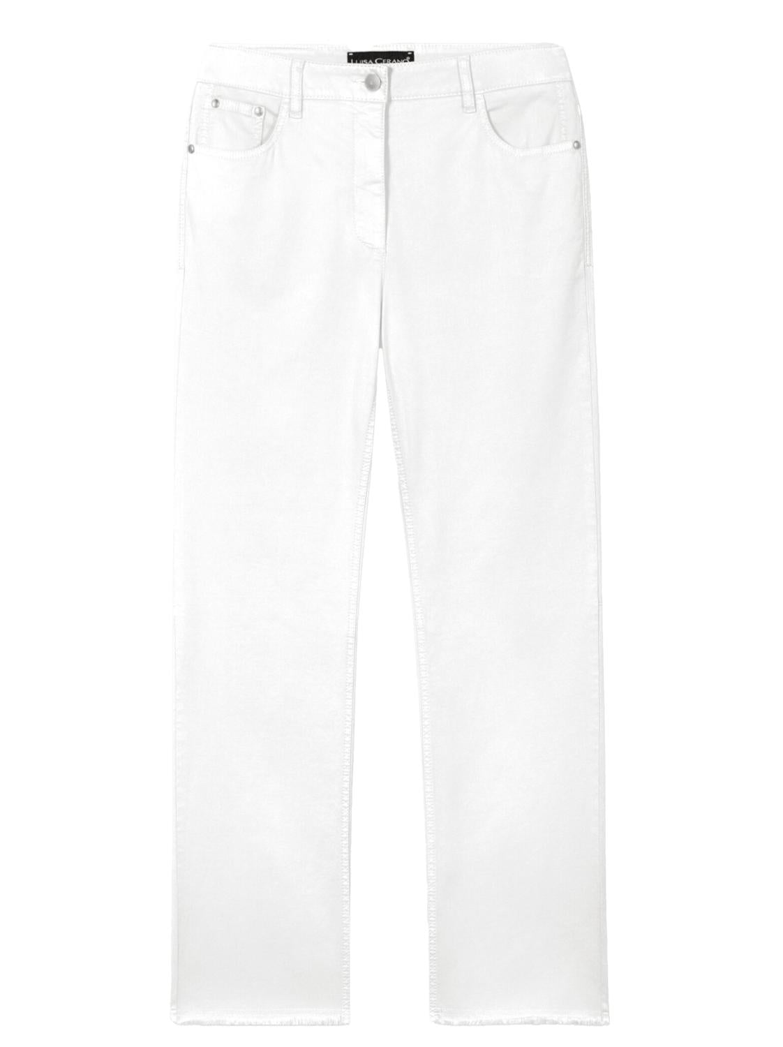 Broek van zacht, elastisch, gekleurd denim in een klassiek five-pocket-model. De rand van de zomen bij de enkels heeft een onafgewerkte look met korte franjes.