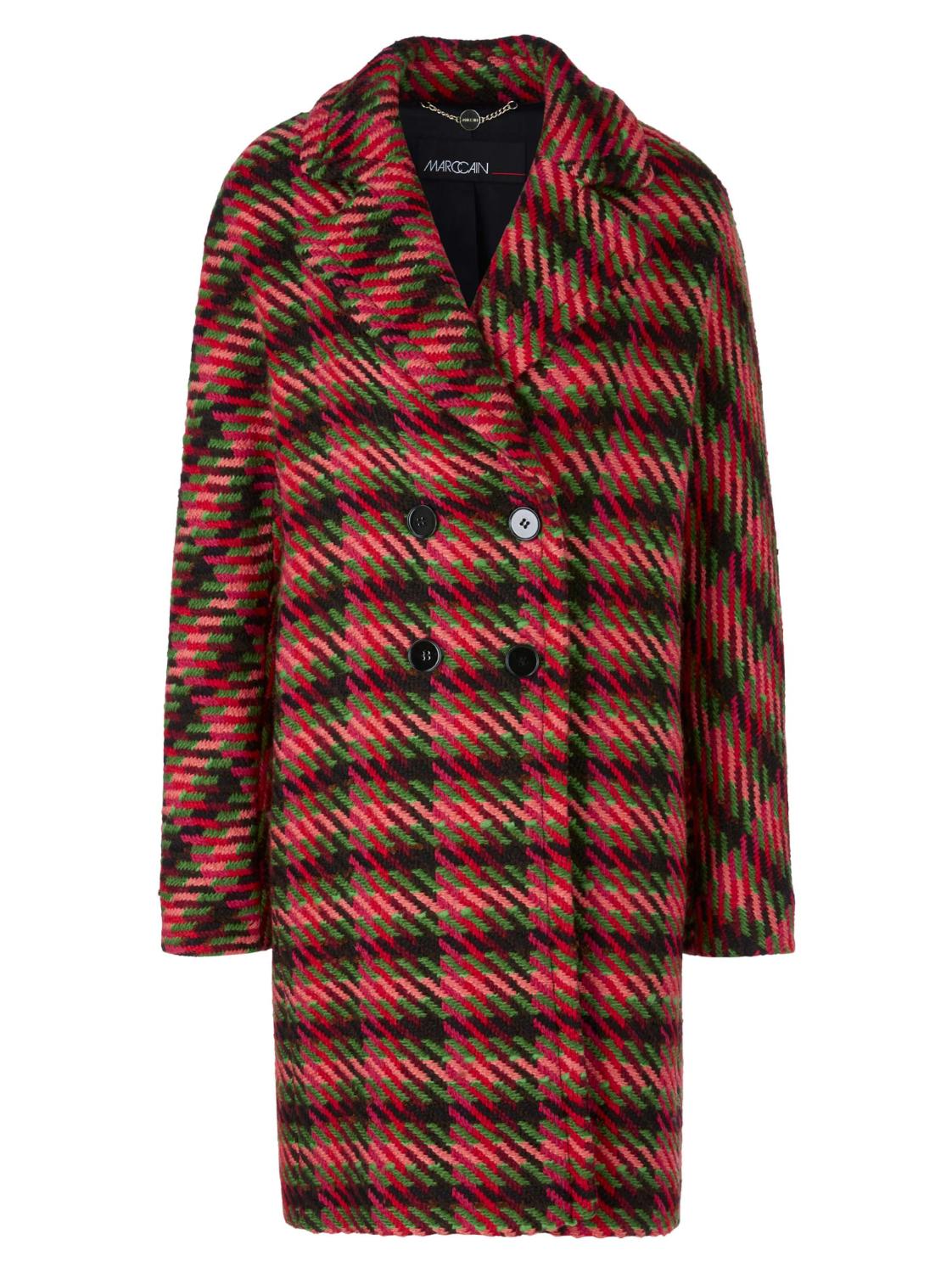 Het modemoment van deze mantel ligt in de coole ruit en het lichte en volumineuze materiaal op basis van wol. Uitgesproken kenmerken zijn de kimonomouwen en een voorpand met twee rijen knopen. De revers sluit hoog en heeft een neerhangende vorm.