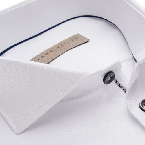 Dit wit tailored fit overhemd is ontworpen in een strijkvrije kwaliteit. John Miller tailored fit overhemden zijn licht getailleerd waardoor deze een ruim pasbereik hebben. De strijkvrije kwaliteit van de stof zorgt ervoor dat het overhemd na het wassen, voor een kreukvrij resultaat, niet gestreken hoeft te worden. Het overhemd heeft een modische cutaway boord waarbij de punten van de boord naar achteren zijn weggesneden. De linker manchet heeft een subtiel geborduurd logo.