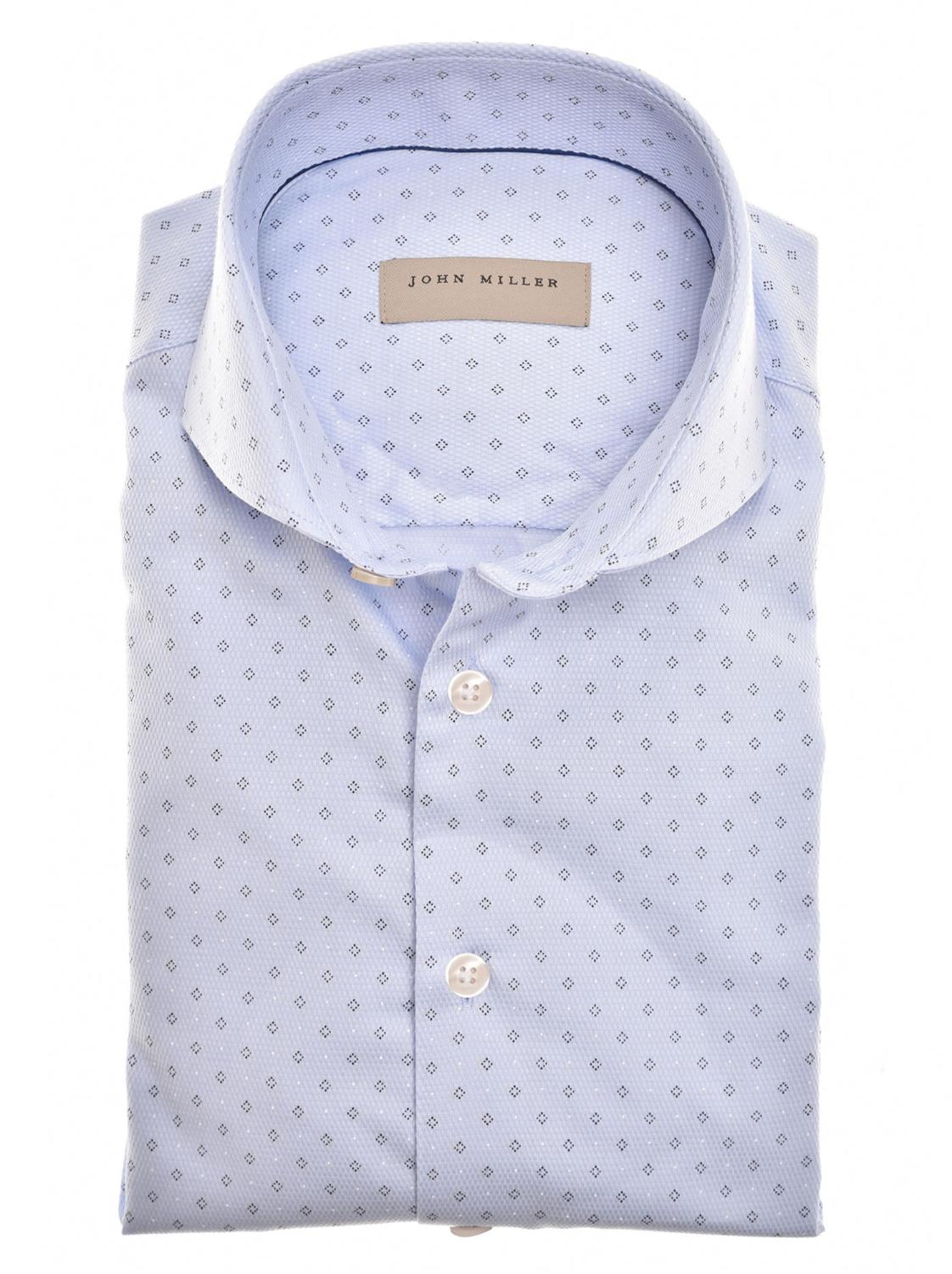Dit lichtblauwe getailleerde overhemd met print is ontworpen in een makkelijk te onderhouden kwaliteit. John Miller getailleerde overhemden zijn licht getailleerd, waardoor ze een brede pasvorm hebben. De makkelijk te onderhouden kwaliteit van de stof zorgt ervoor dat het overhemd slechts licht gestreken hoeft te worden voor een glad resultaat. Het overhemd heeft een modieuze cutaway kraag waarbij de punten van de kraag naar achteren zijn weggesneden. De linker mouwboord heeft een subtiel geborduurd logo.