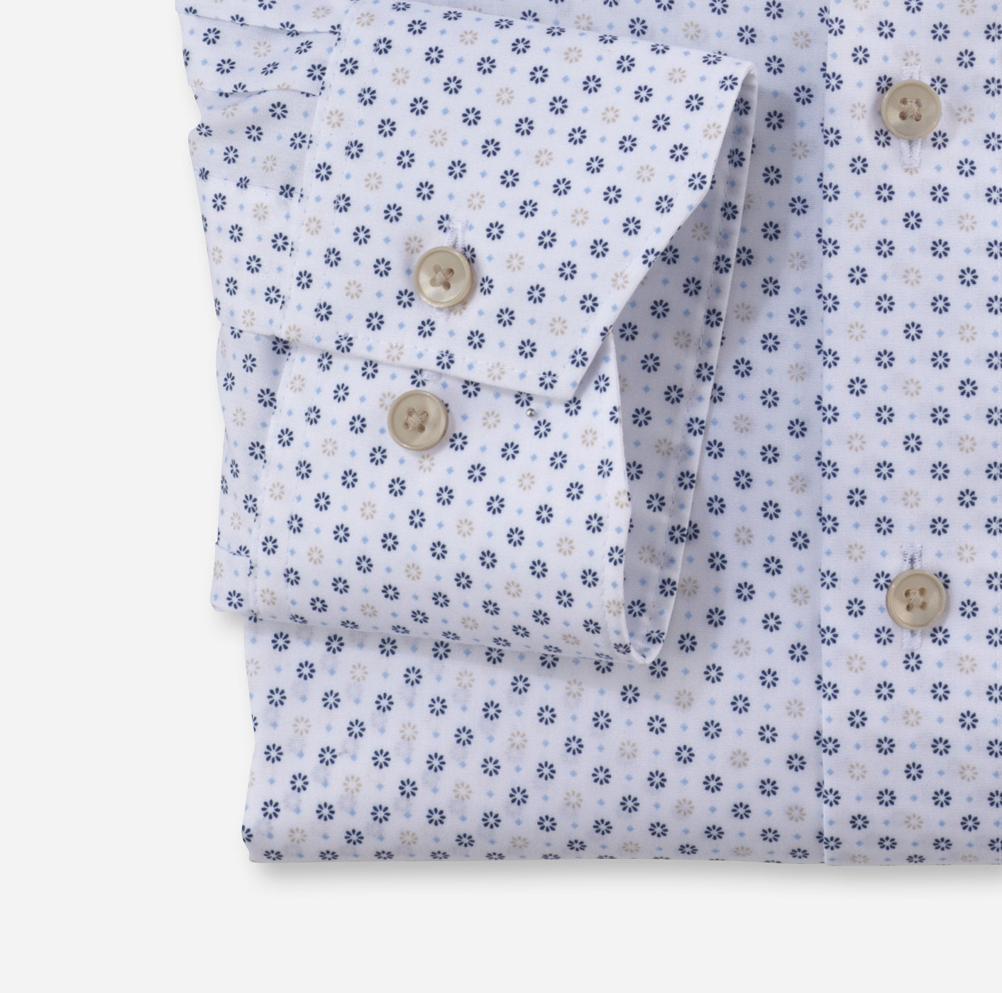 Perfect voor de lente en zomer: gemaakt van een soepele en koele poplinstructuur van fijne katoengarens. Ook het charmante minimalistische design in een harmonieuze kleurcompositie geeft deze sportieve OLYMP Luxor een zomers frisse en lichte touch. De mannelijke business-performance wordt onderstreept door een modieuze global-kentkraag. Strijkvrij.
