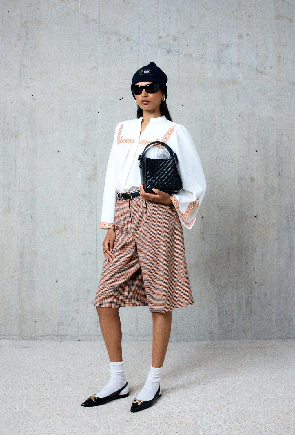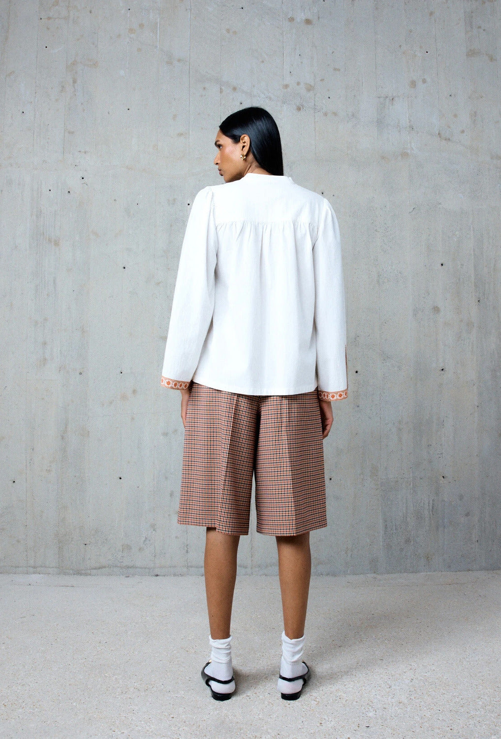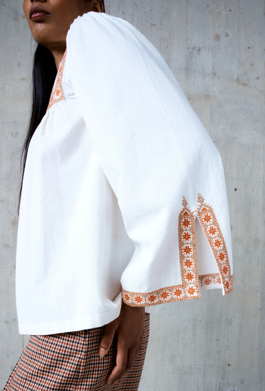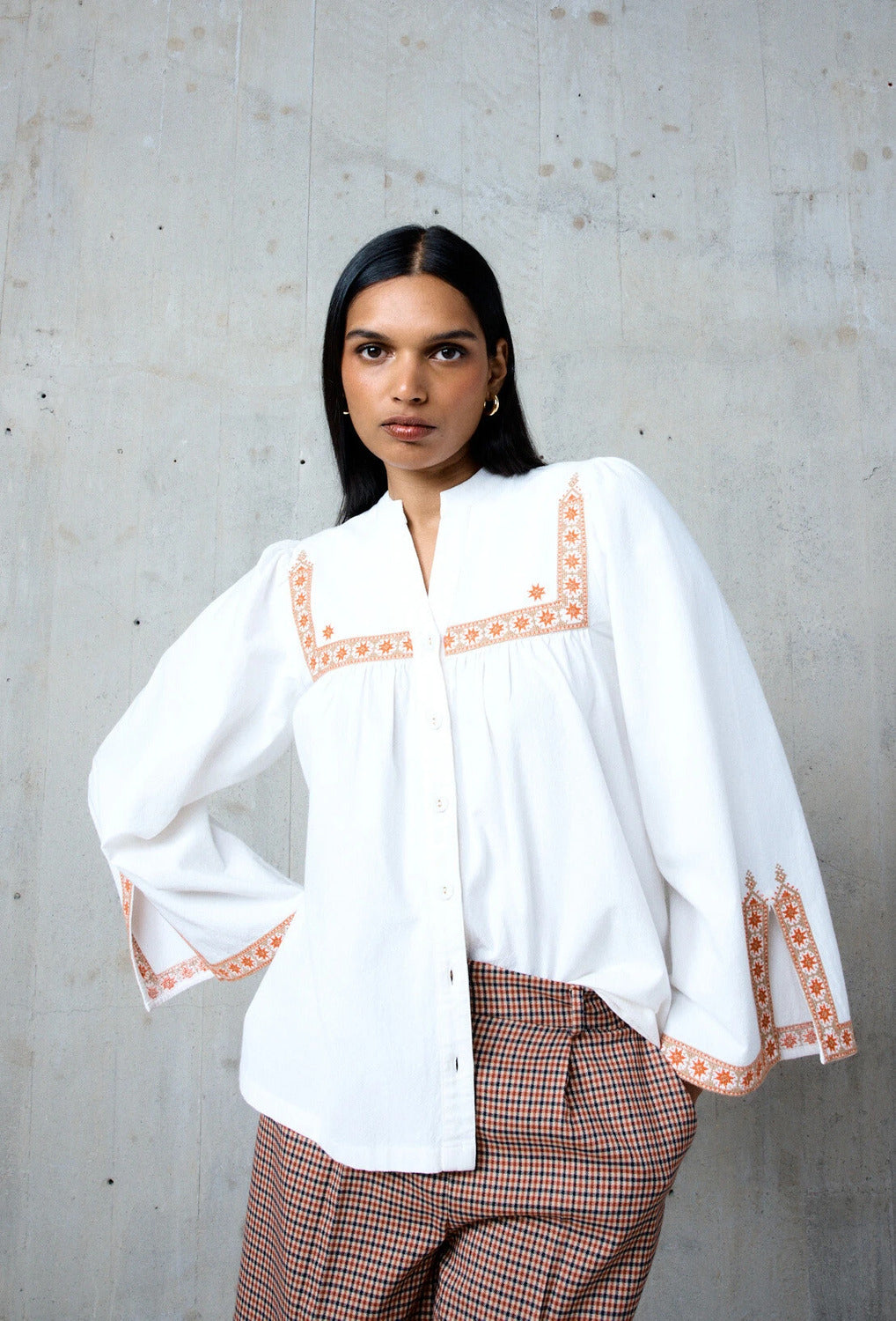 Galatée is ons korte, losse shirt van getextureerd katoen. Mao kraag afgewerkt met een knoop en geaccentueerd met contrasterende stiksels. Vooropening met stoffen knoopsluiting. Rimpeldetail op borst en rug voor volume. Kruissteekborduurbanden boven de borst en onderaan de mouwen. Losse kimono-stijl mouwen. Het Galatée shirt is een karakteristiek item en is ook verkrijgbaar als lange jurk voor verschillende looks.