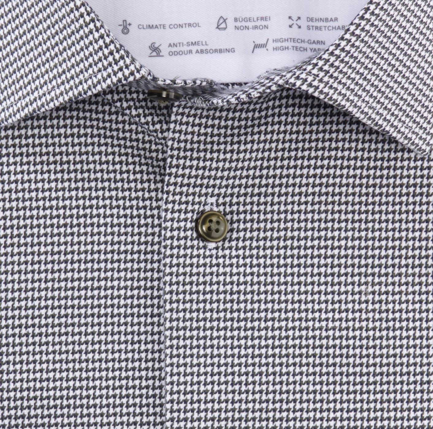 Een subtiel patroon in steenrood, een licht getailleerde lijn en een mondaine global kent-kraag onderstrepen de sportieve prestaties van zelfverzekerde zakenmannen. Met innovatieve CLIMATE CONTROL-garens vult deze OLYMP Luxor de beproefde verzorgende en bewegingsvriendelijke Dynamic Flex-eigenschappen aan met temperatuur- en vochtregulerende functies. Het contrasterende beleg van de binnenkraag is een modieuze blikvanger.