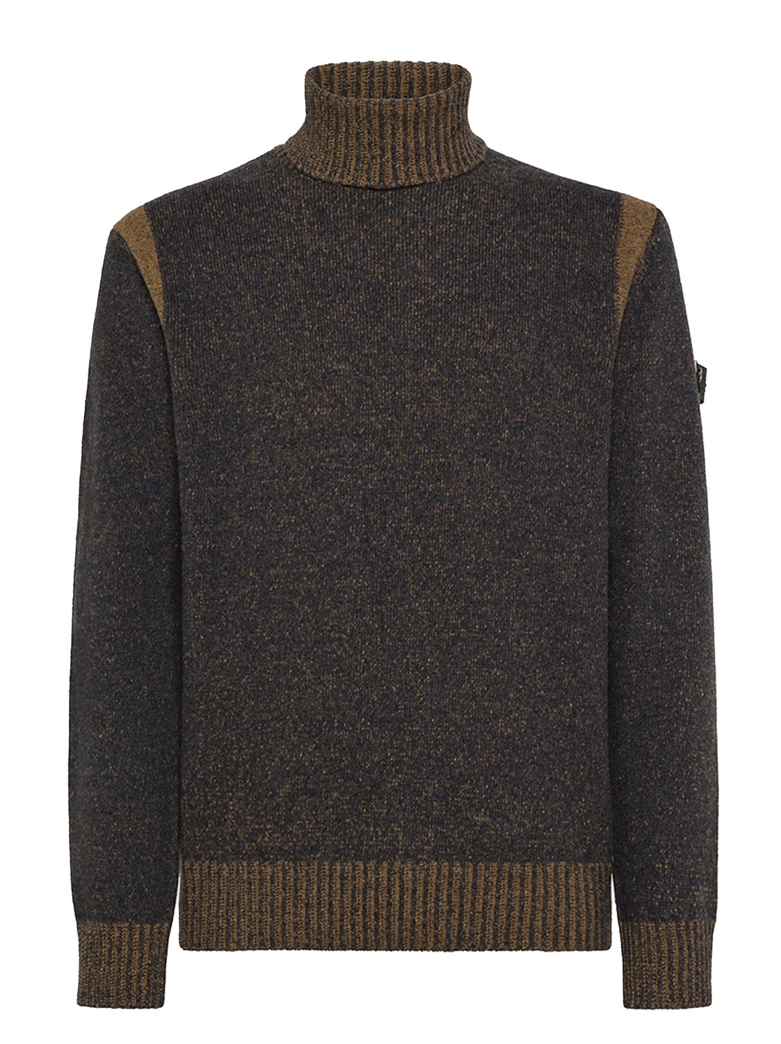 Gebreide trui van wolmix met een vanisé-effect dat de tinten en kleurverlopen benadrukt. Dit effect wordt bereikt door garens van verschillende kleuren te gebruiken om een contrasterend of geschaduwd patroon te creëren, waardoor de stof een unieke en decoratieve look krijgt. Hoge kraag, lange mouwen en geribbelde manchetten en onderkant. Logo op de linkermouw vastgemaakt met knopen. Zacht aanvoelend, de stilistische kenmerken accentueren het sportieve en casual karakter.
