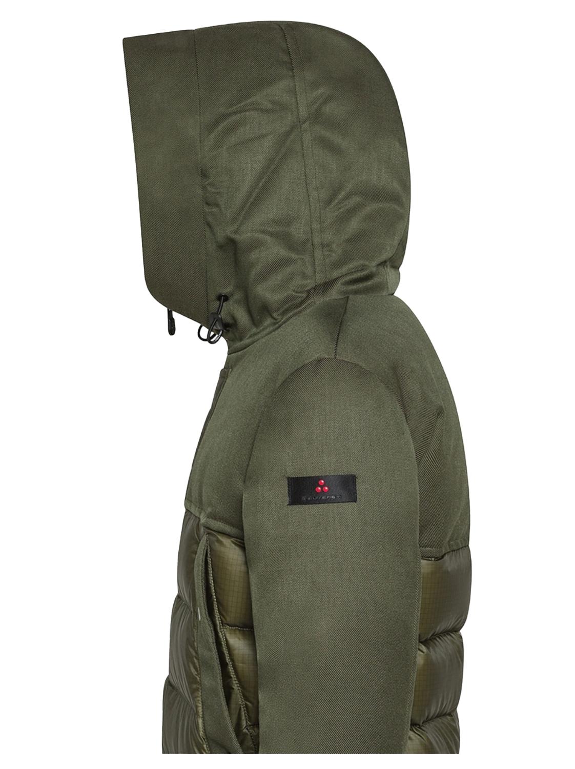 Jack uit twee materialen: verfijnde en resistente boorwol en cordura nylon aan de bovenkant en op de mouwen; ultrafijn, glanzend 7 denier ripstop nylon, met kanaalvulling, aan de onderkant. De cordura in combinatie met de wol maken de stof bijzonder sterk, samen met de rijke technische uitstraling dankzij de combinatie van garens van verschillende kleuren. Het kledingstuk is nog unieker gemaakt door het lichte en resistente nylongedeelte en de teddyachtige namaakbontcoating op de capuchon en de voering aan de voorkant. Dit kledingstuk is gewatteerd met gerecycled dons en heeft een centrale ritssluiting met dubbele schuif, gedeeltelijk verborgen door een flap met knopen en elastische sleuven, en hoge zijzakken met drukknopen. Waterafstotend. Een nieuwigheid van dit seizoen, ontworpen tot in het kleinste detail om op te vallen en te presteren.