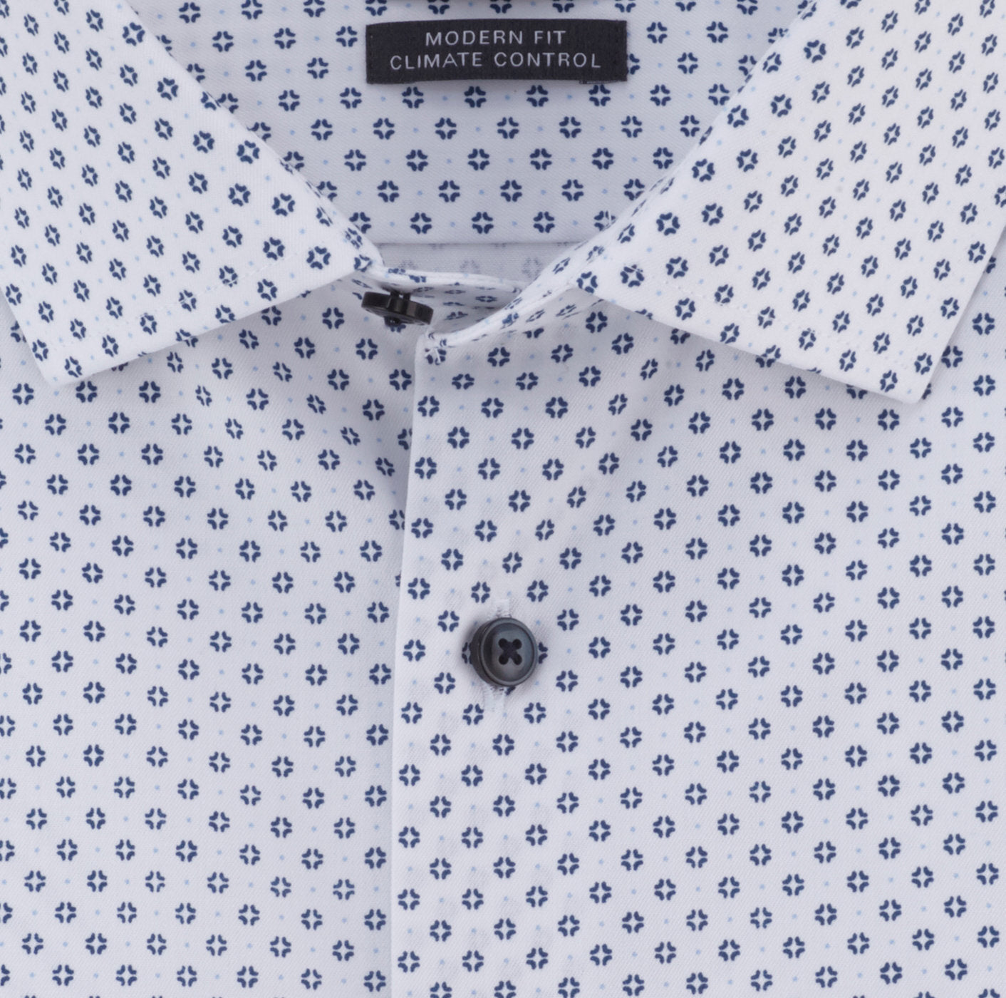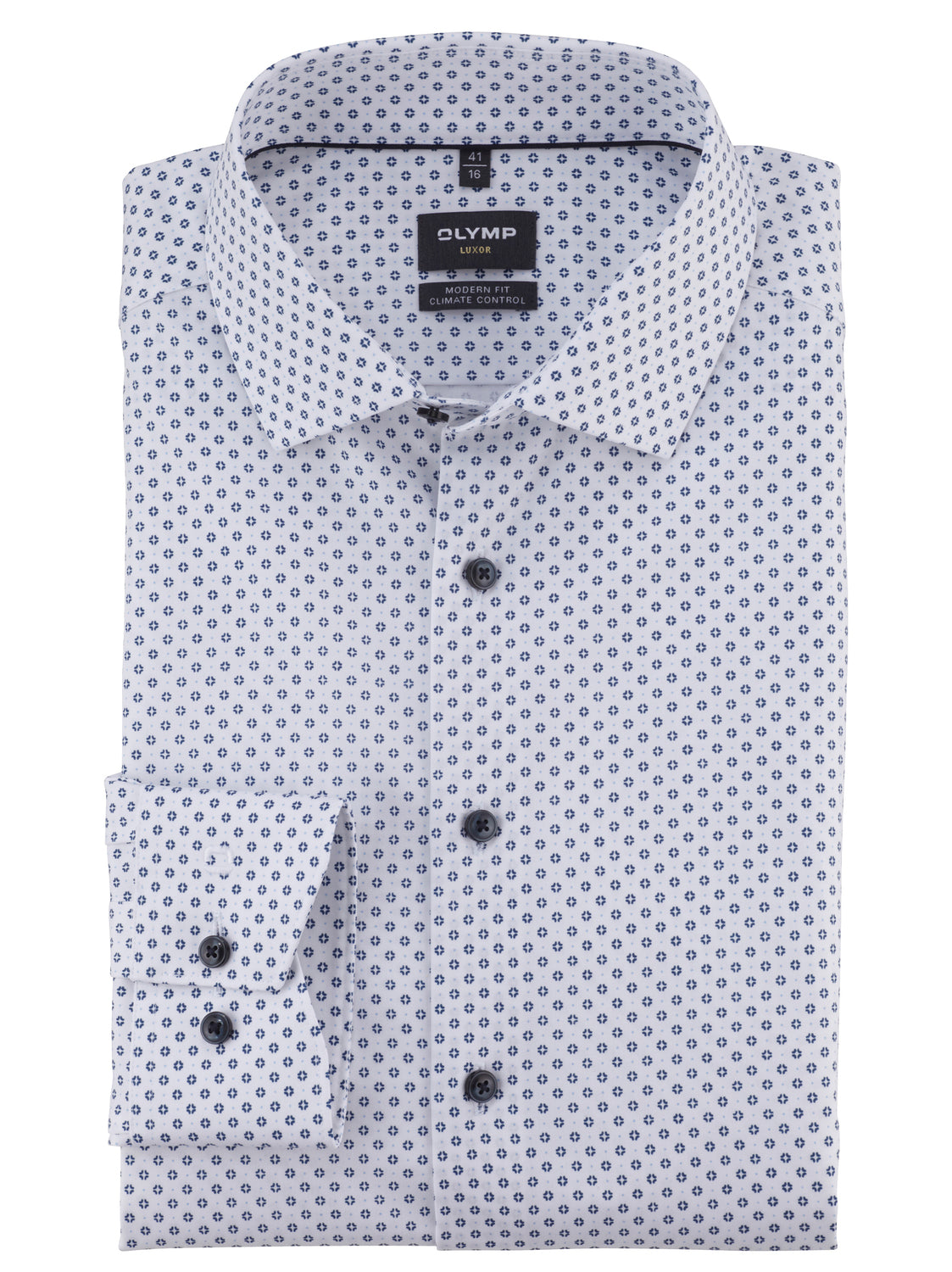 Follow the sun. Dit OLYMP Luxor-climate-control-overhemd heeft een sympathieke minimalistische print in blauw op wit. De innovatieve vezelmix is ​​onderhoudsvriendelijk, ademend, rekbaar, sneldrogend en temperatuur- en vochtregulerend. Met een sportieve, nauwsluitende snit en kosmopolitische global-kentkraag.