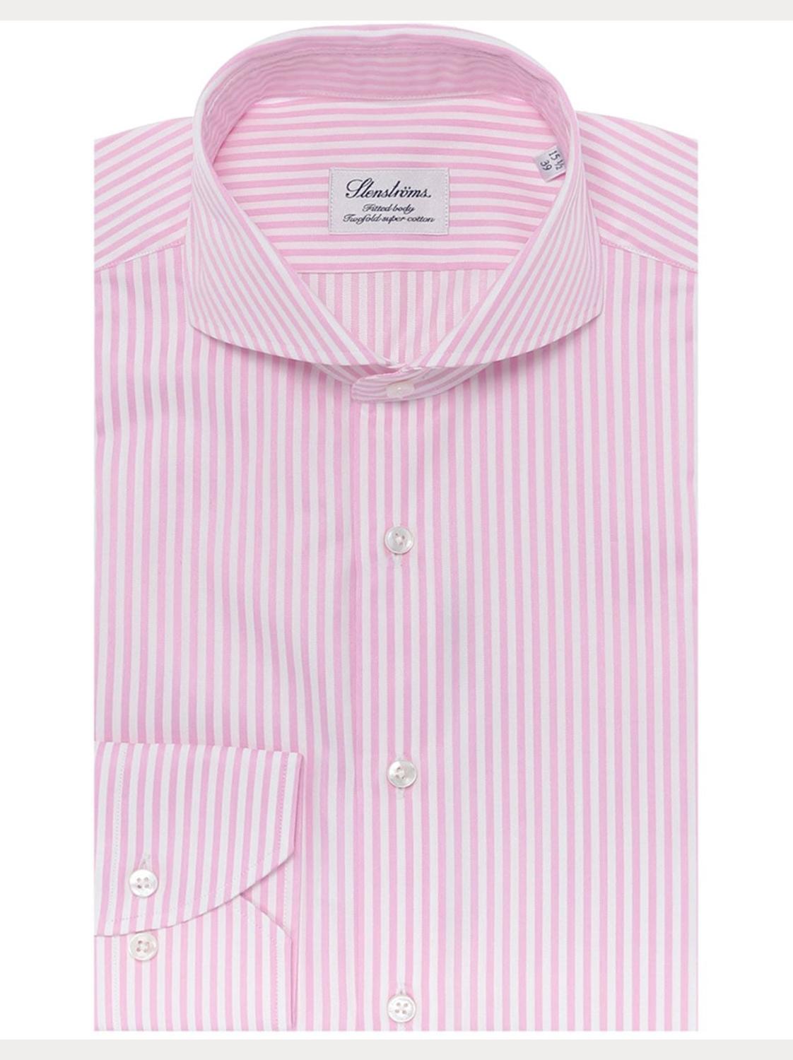 Dit Fitted Body-shirt is gemaakt van lichtgewicht en zacht katoen Lyocell met extra stretch voor een licht getailleerde taille en flexibele pasvorm. De stof heeft een visgraatpatroon en een glad oppervlak met strepen. Gedetailleerd met parelmoeren knopen en een cut away kraag. Draag hem onder een bijpassende chino en rol de mouwen op voor een casual stijl
