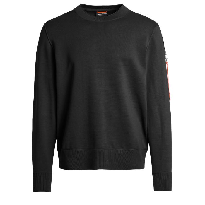 Zwarte sweater model Braw van Parajumpers. Deze sweater heeft een geribbelde crewneck en een Parajumpers logo op de linkerarm.